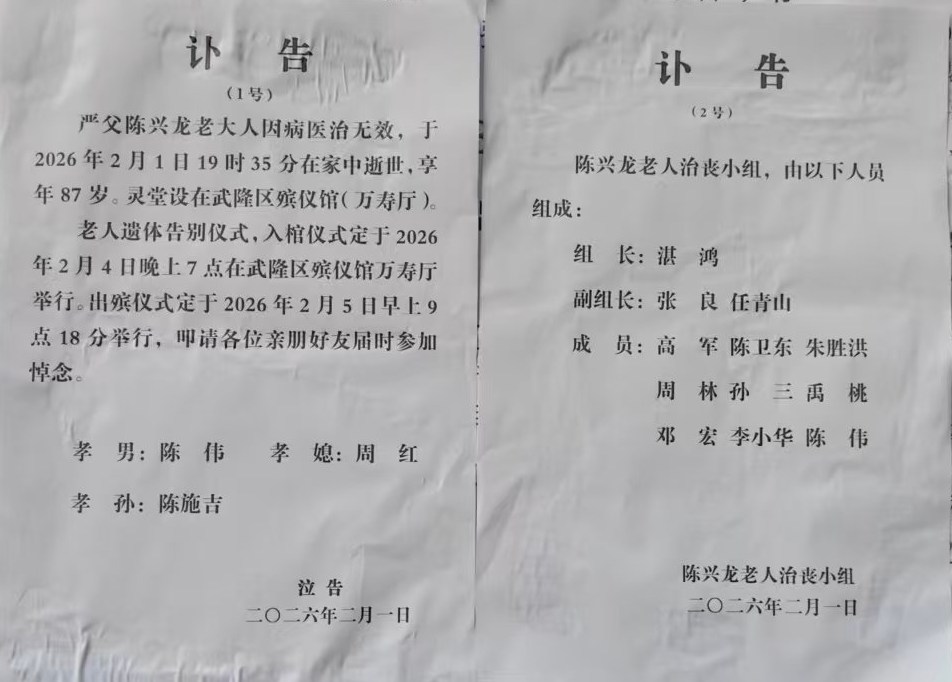 陈延训老人因病去世,定于2月4日在区殡仪馆(福禄厅)坐夜
