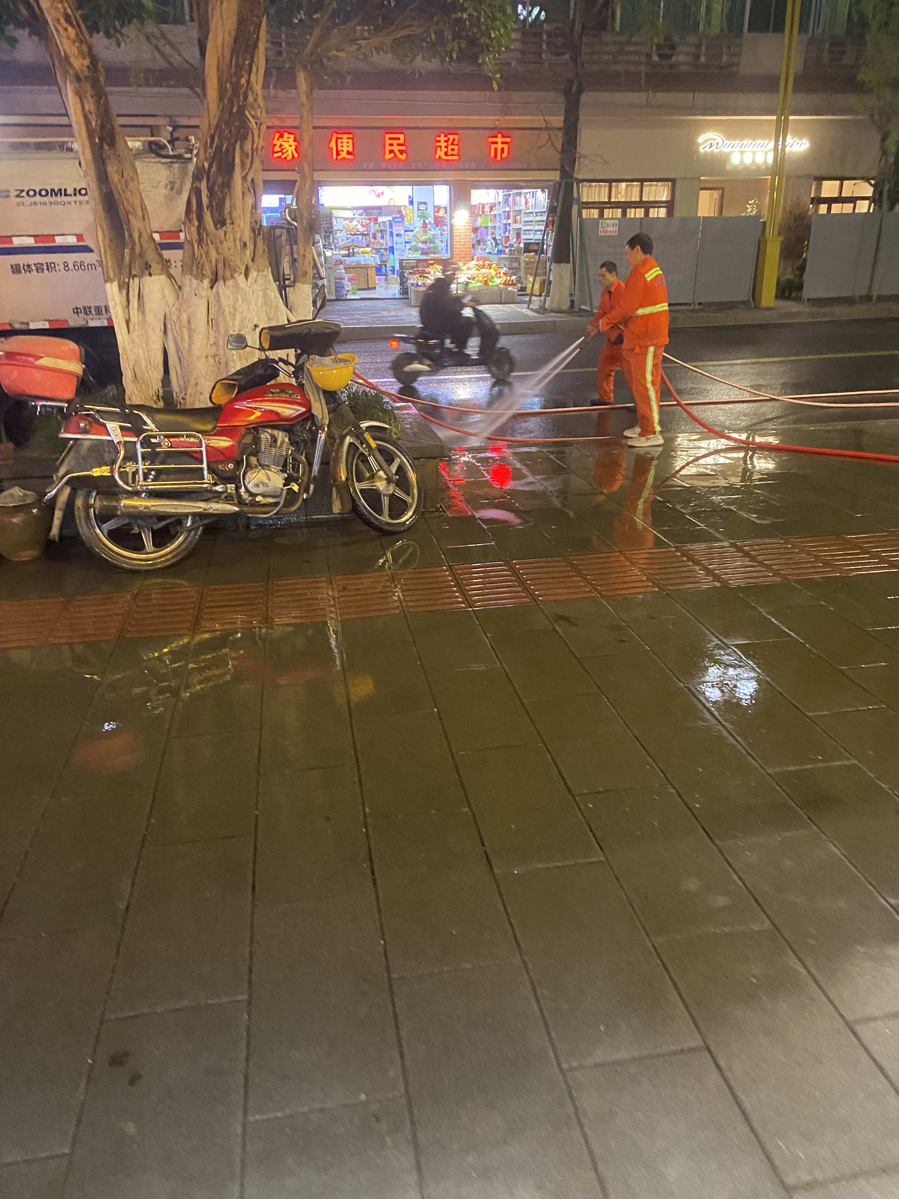 哦豁,环卫工人辛辛苦苦冲了的街道,又稀里哗啦下雨了