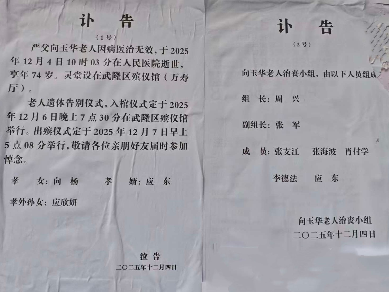向玉华老人因病去世,定于12月6日在殡仪馆万寿厅举行遗体告别..