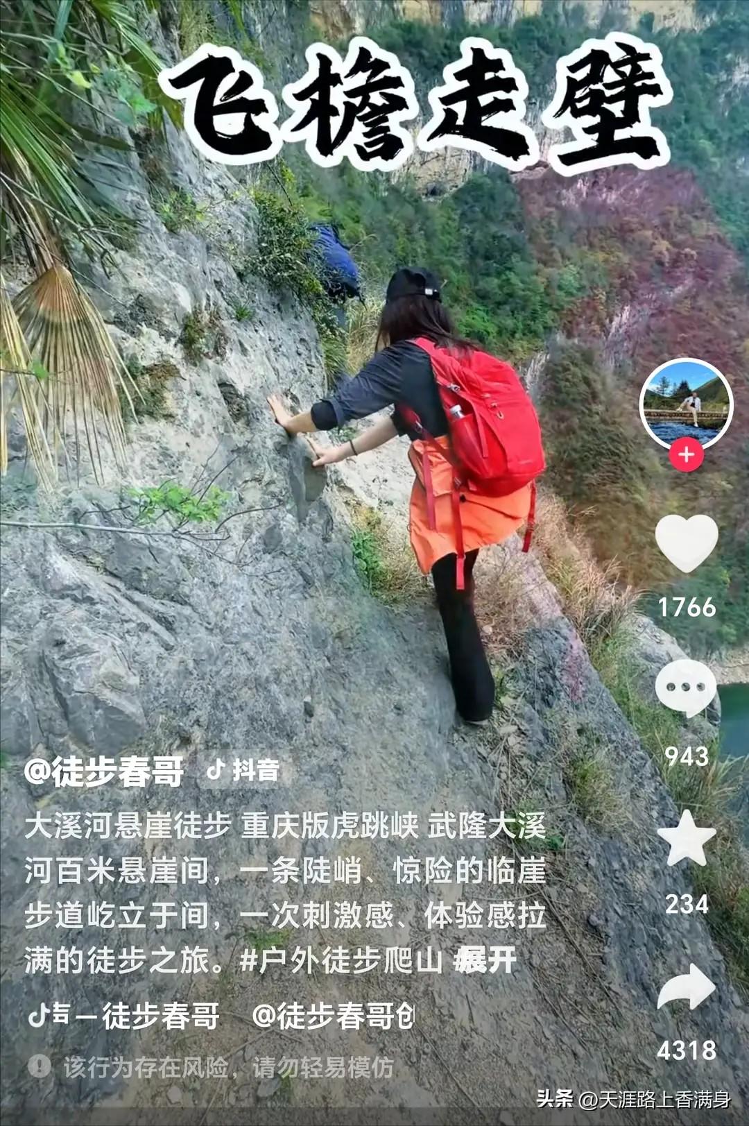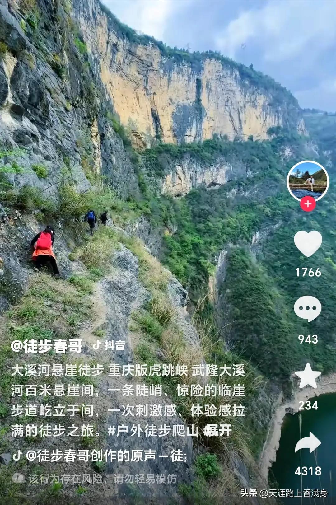 最近,一则视频在网络上掀起波澜,霸屏各大平台。画面中,悬崖徒步爱好者们置身于有着重庆版“虎跳峡”美誉的大溪河边百米悬崖之上。他们在陡峭得令人望而生畏、危险万分的山腰小道上艰难攀爬,自行开辟着前行之路。晃动的镜头,脚下深不见底的万丈深渊,险象环生,哪怕只是看着视频,都不禁让人胆战心惊,更遑论亲身前往一试身手了。