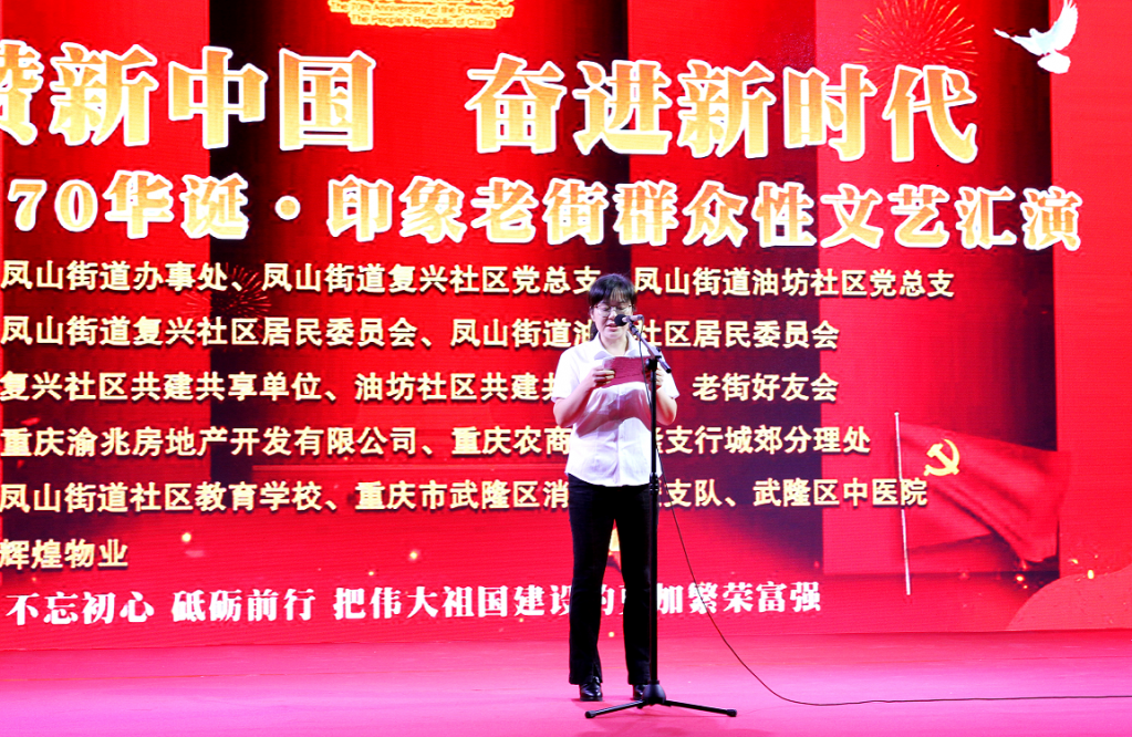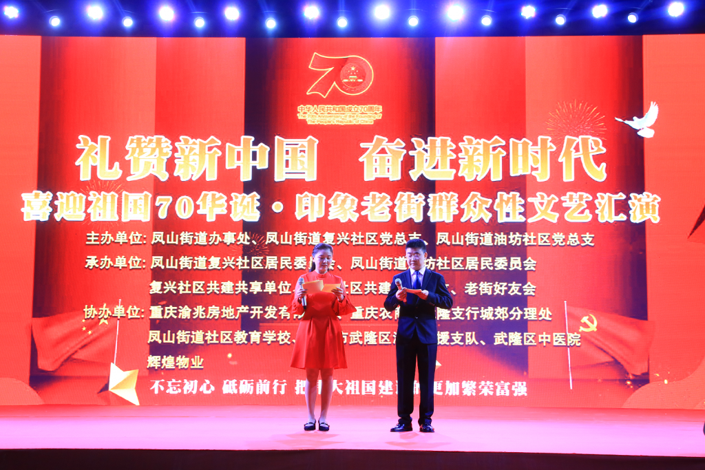 为喜迎国庆,营造一个欢快的节日氛围,增强社区居民的爱国热情,9月26日晚七点半,由武隆区凤山街道党工委、办事处,复兴社区党总支和油坊社区党总支主办,凤山街道复兴社区居民委员会、凤山街道油坊社区居民委员会、复兴社区共建共享单位、油坊社区共建共享单位、老街好友会承办,重庆渝兆房地产开发有限公司、重庆农商行武隆支行城郊分理处、凤山街道社区教育学校、重庆市武隆区消防救援支队、武隆区中医院辉煌物业协办的印象老街大型群众性文艺汇演在渝兆广场隆重开演。
